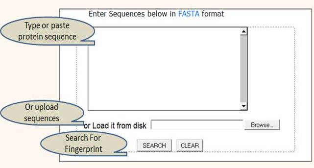 The user can paste/upload protein sequences in FASTA format in the provided text area.